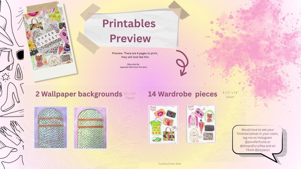 This digital printable set includes- 2 Hand-Painted Closet Wallpaper Backgrounds (Green floral and pink floral) Sized to print at 11" x 14" or smaller, 14 Mix-and-Match Wardrobe Pieces Includes purses, shoes, outfits, and accessories Sized to print on 8.5" x 11" sheets for easy cutting Recommendations for Printing Tips, options for framing/ display- sample layouts, Terms and Conditions & What’s coming!